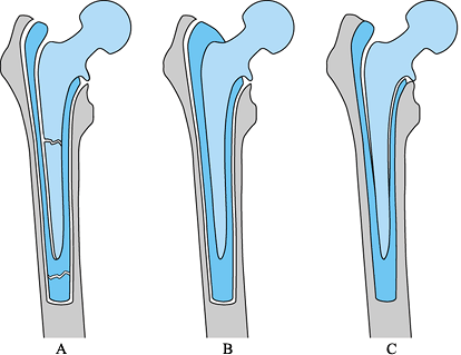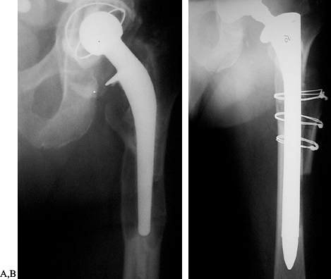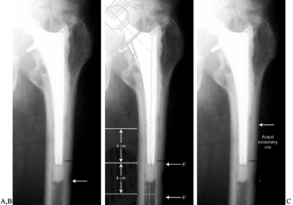 Figure 106.1. A: Periprosthetic fracture treated with plates and strut grafts. B: Refractures with weight bearing. C: Revised with a fully coated component acting as intramedullary fixation reinforced with strut grafts.