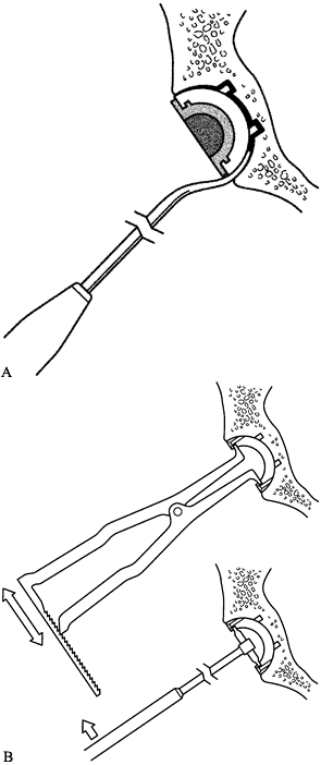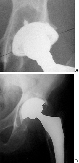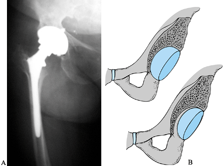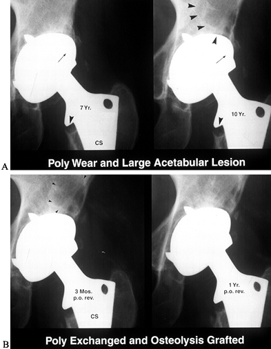 Figure 106.4. A: Polyethylene wear leading to large supra-acetabular lesion. Note asymmetric position of the head in the cup. B: Cup is stable; therefore, retained and osteolytic lesion grafted with good results.