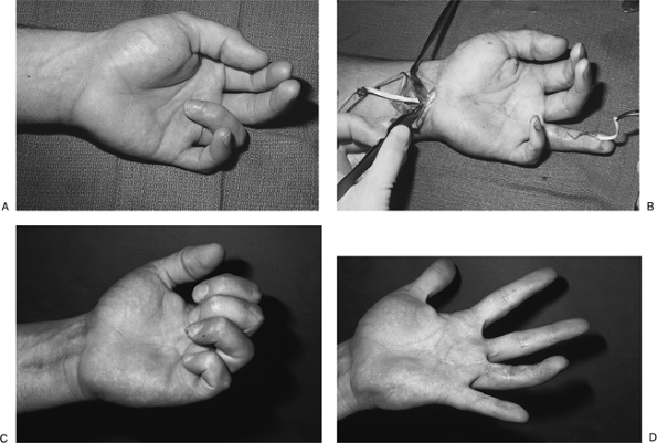 Two-stage Hunter tendon reconstruction for a fixed-flexion contracture of the ring finger following a failed flexor tendon repair. A. Note the fixed flexion contracture of the ring finger; passive extension was not possible. B. Insertion of a free tendon graft using the plantaris tendon. The plantaris tendon graft (left) is being drawn into the new flexor sheath by the Hunter tendon (right), following joint release, pulley reconstruction, and insertion of a Hunter tendon 4 months prior. C, D. Note the active flexion and nearly complete extension of the reconstructed finger. |