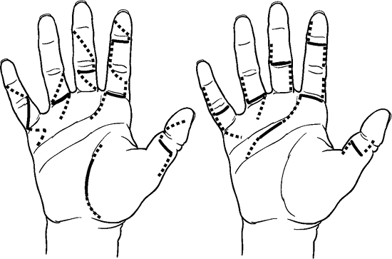 interphalangeal (DIP) joints, and the palmar surfaces of the proximal