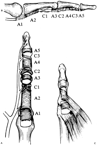 Thumb (note annular pulleys at the metacarpophalangeal and just proximal to the interphalangeal joint with oblique pulley over proximal phalanx). (C modified from Doyle JR, Blythe WF. Anatomy of the Flexor Tendon Sheath and Pulleys of the Thumb. J Hand Surg 1977;2:150.) |