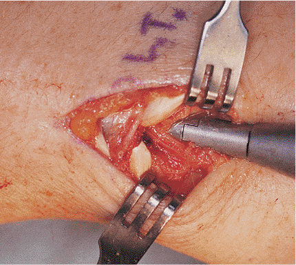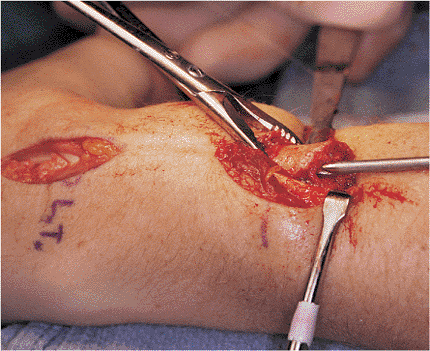 Lister’s tubercle at the distal radius (Fig. 11.5). The extensor pollicis longus (EPL) tendon is identified and