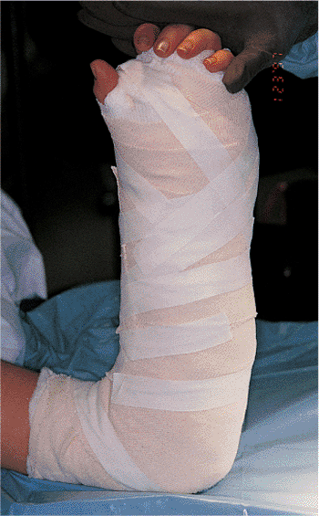 To reduce swelling and control pain, a bulky hand dressing is postoperatively incorporated via use of a sugar-tong splint that provides even compression. The dressing is removed at 2 postoperative weeks for suture removal. |