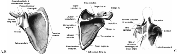 Figure 15.1. A: Muscle attachments on the anterior aspect of the scapula. B: Muscle attachments on the posterior aspect of the scapula. C: