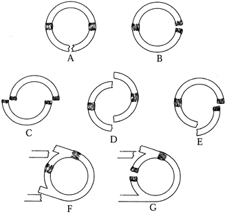 Figure 15.5. Types of traumatic ring/strut disruptions. Single disruptions of the bone–soft-tissue ring may be a break (A) or a ligament disruption (B). Double disruptions of the bone–soft-tissue ring may be a double-ligament disruption (C), a double break (D), or a combination of a bone break and a ligament disruption (E). Other double disruptions may be a break of both struts (F) or a break of one strut and a ring disruption (G).