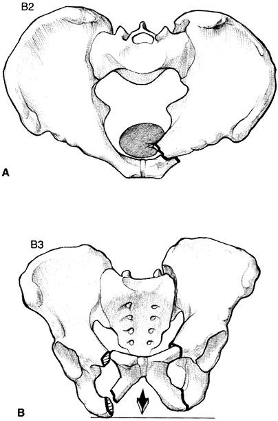 Figure 21-2. A: Type B2 lateral compression injury (ipsilateral). B: Type B3 lateral compression injury (contralateral). (From Hansen ST, Swiontkowski MF. Orthopaedic trauma protocols. New York: Raven, 1993:228.)