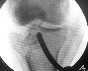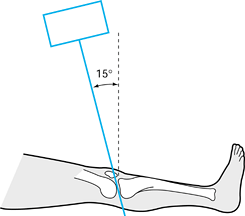 To obtain a tibial plateau view, the x-ray beam is angle caudally 15°. (From Koval KJ, Helfet DL. Tibial Plateau Fractures: Evaluation and Treatment. Journal of the American Academy of Orthopaedic Surgeons 1995;3:86, with permission.) |