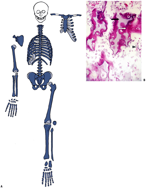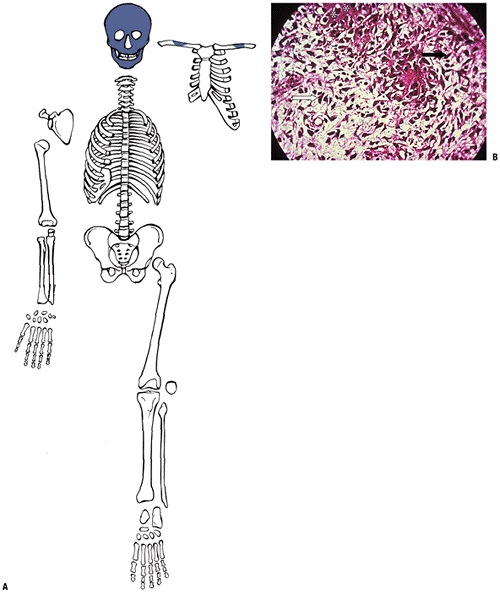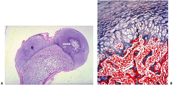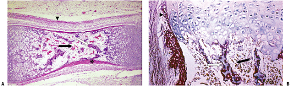 (A) Seven-week embryo with well-developed limb buds. Lower limb development lags behind upper limb throughout life. Rapidly developing cells are susceptible to insult. (B) Limb bud cross-section showing central condensation of immature cartilage cells (appearing as dark dots at this power) forming two early cartilage models with immature matrix production (white arrows), as well as the dark zone between the two cartilage models that will become a joint (black arrow). (Courtesy of the Armed Forces Institute of Pathology, Washington, DC.) |
