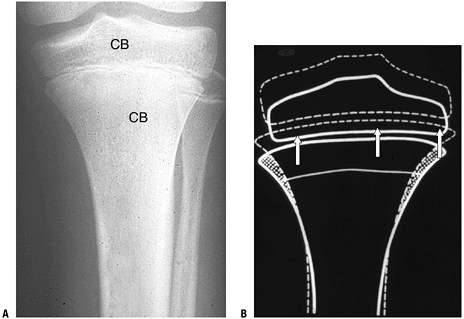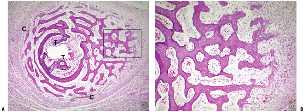 Figure 14-17 Modeling. (A) Proximal long bone whole mount specimen. Arrows show site of active metaphyseal cutback; osteoclast activity has temporarily deleted a portion of the cortex (arrow). (B) Another specimen shows a higher-power view of zone of complete cortical deletion adjacent to primary trabeculae (arrow).