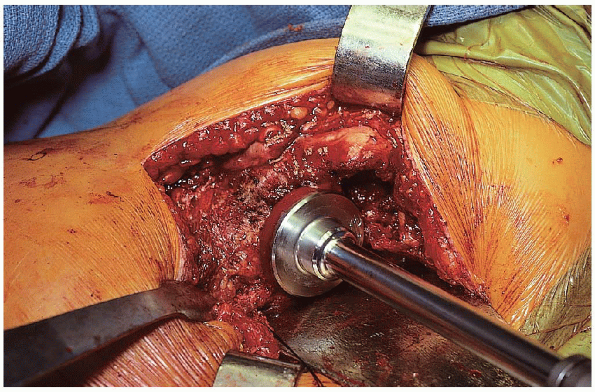the femoral canal in line with femur, directed toward the knee (Fig. 22-13). The femoral canal is reamed using hand or power reamers