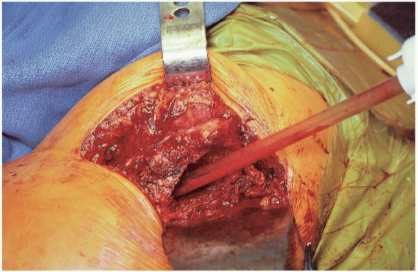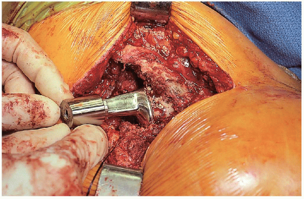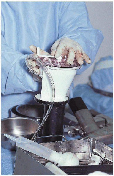 depth before cement insertion (Fig. 22-20). The cement is vacuum mixed and inserted in retrograde fashion using a cement gun and good pressurization technique (Figs. 22-21 and 22-22).
