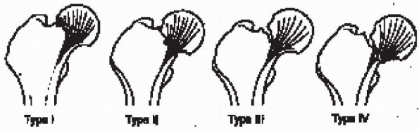 FIGURE 22-2. The Garden classification of femoral neck fractures. From Hansen S, Swiontkowski M, Orthopedic trauma protocols. New York: Raven Press, 1993:238.