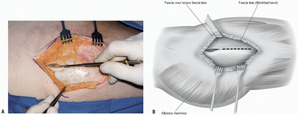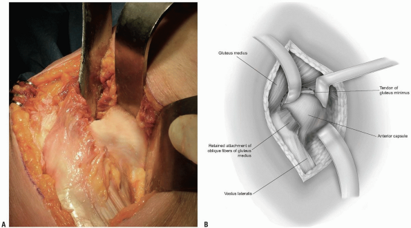 The trochanter is retracted proximally and the anterior fibers of the gluteus medius are released both anteriorly (Fig. 7-56A) and posteriorly (Fig. 7-56B,C).