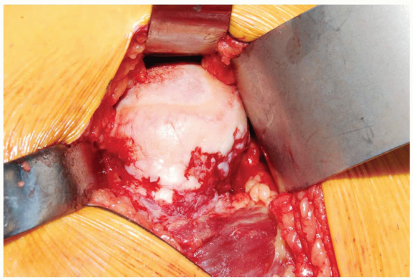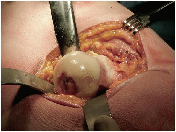 The capsule is excised (Fig. 7-58) and the femoral head is dislocated anteriorly by external rotation of the thigh.