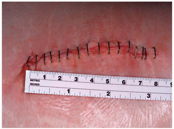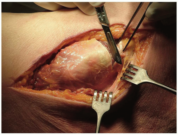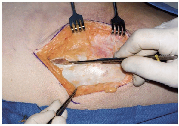 Proximally, the skin incision extends 6 to 8 cm in line with the fibers