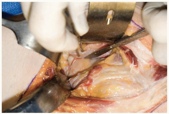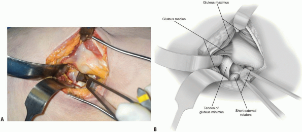 On further retraction of the trochanter proximally, the gluteus minimus is separated from the capsule with scissors (Fig. 7-57).