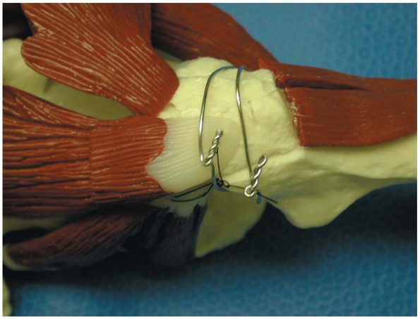 Reattachment. For this osteotomy two circumferential monofilament wires are effective and easy to apply (Fig. 7-64).