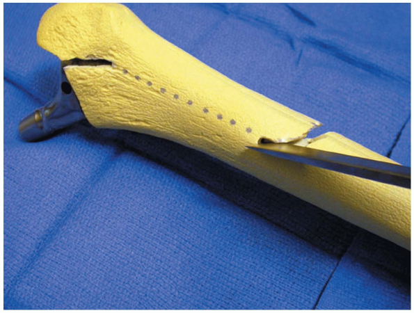 Anteriorly, a series of drill holes are used to allow the osteotomy to hinge anteriorly (Fig. 7-66).