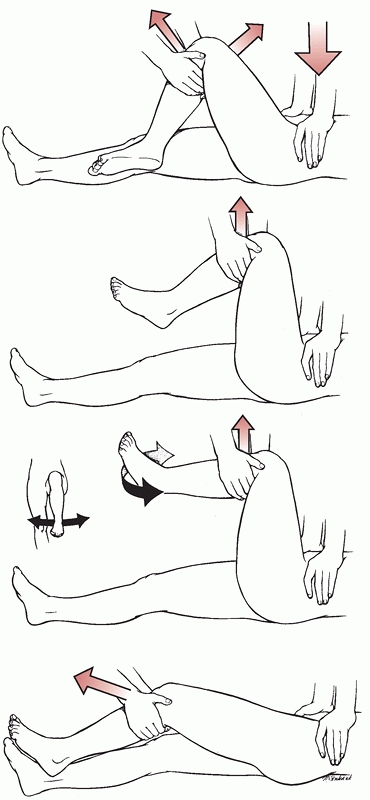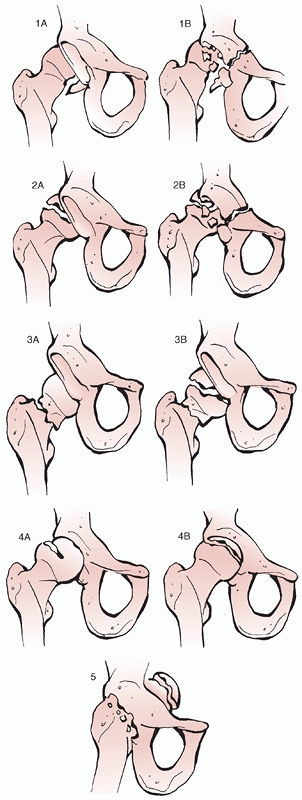 The position of the hip during axial loading determines the type of injury. Increasing flexion, adduction, and internal rotation favors pure dislocation, while lesser degrees of each leads to fracture-dislocation. (Adapted from Letournel E, Judet R. Fractures of the Acetabulum. 2nd ed. New York: Springer Verlag, 1993.) |