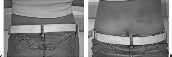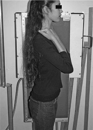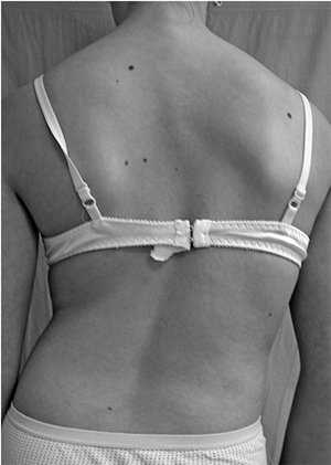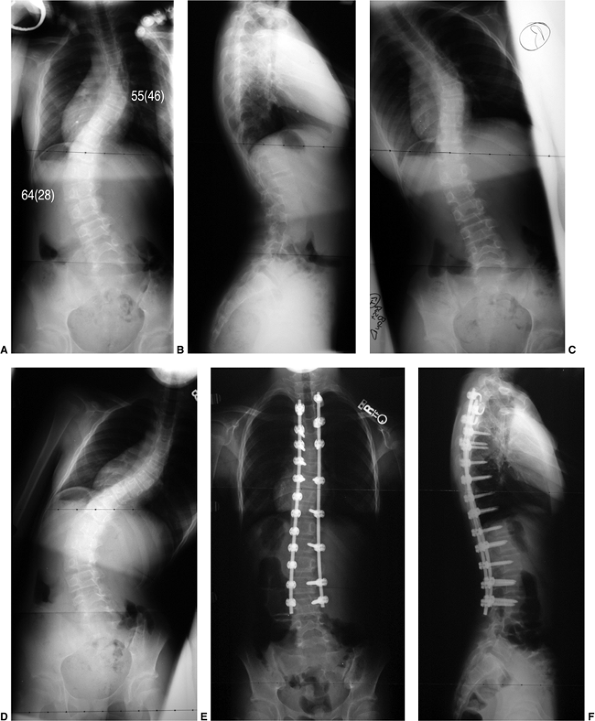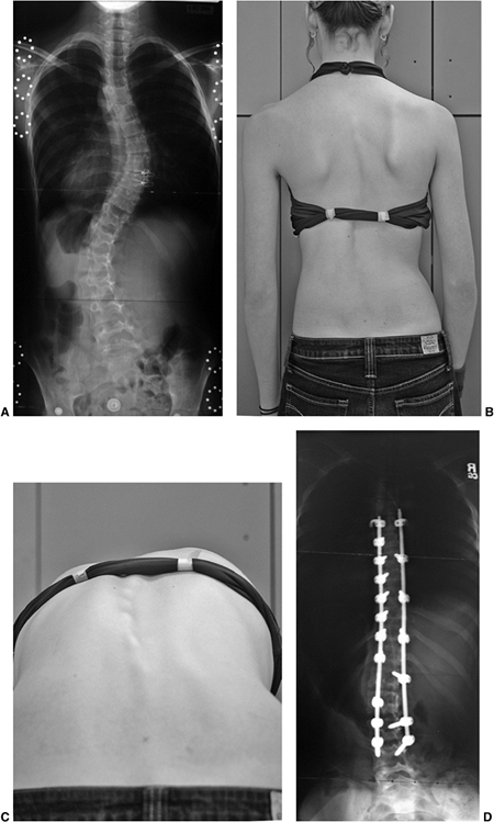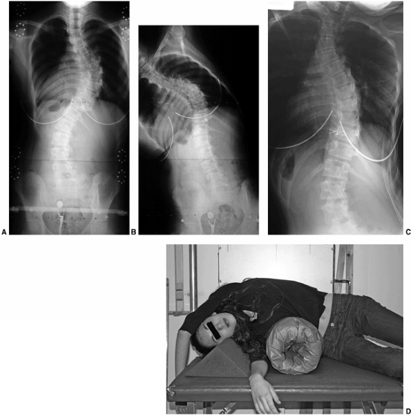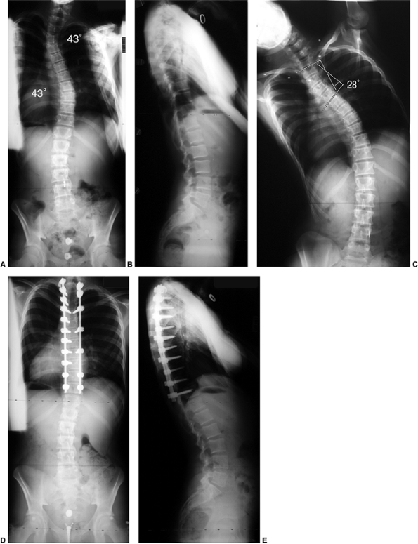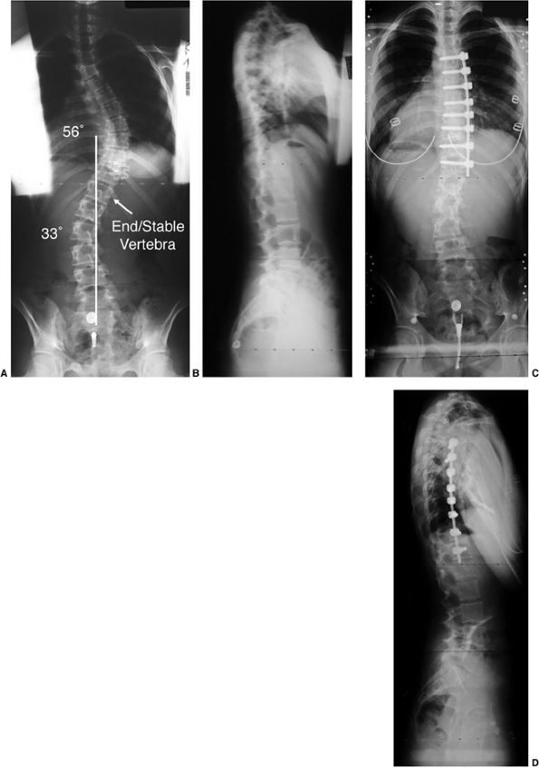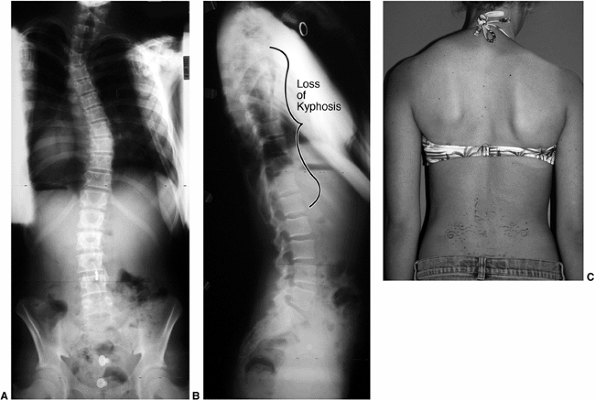 The lateral radiograph demonstrates the relatively straight sagittal profile of the thoracic spine with loss of normal thoracic kyphosis. This is a common feature of adolescent idiopathic scoliosis. C: The clinical appearance of this patient demonstrates a prominent scapula. However, this is not caused by kyphosis but by the rotational deformity of the ribs, which secondarily makes the right scapula more prominent. Additionally, a left upper thoracic trapezial fullness can be appreciated in this patient, caused by the left upper thoracic curvature.  |