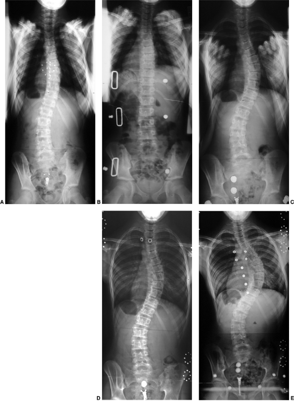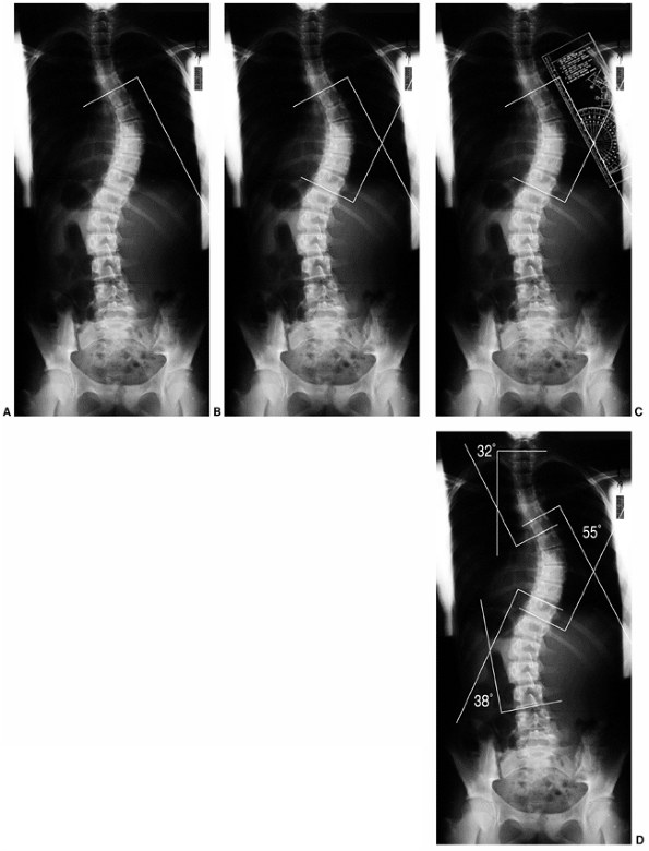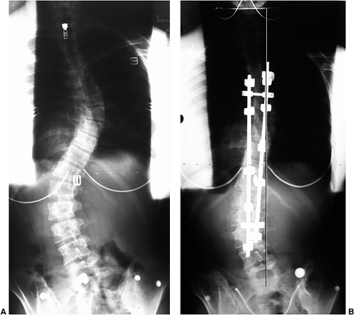 Figure 18.4 A: This posteroanterior radiograph demonstrates the appearance of a double thoracic scoliosis curve pattern. B: