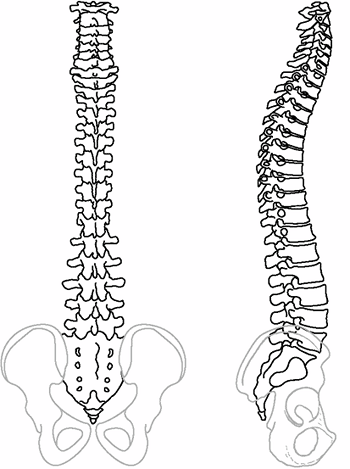 These posteroanterior and lateral schematic drawings of the normal cervicothoracic and lumbosacral spine demonstrate the normal alignment including cervical lordosis, thoracic kyphosis, and lumbosacral lordosis.  |