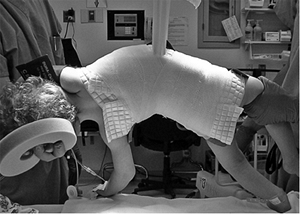 This 16-year-old girl with severe scoliosis refused early treatment and had severe progression. Her clinical examination demonstrated marked trunk and rib deformity, and she had reduced pulmonary function. B: The posteroanterior radiograph demonstrates a right thoracic curvature of 125 degrees. With proper diagnosis and early treatment, deformity such as this should be completely avoidable in AIS.  |