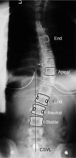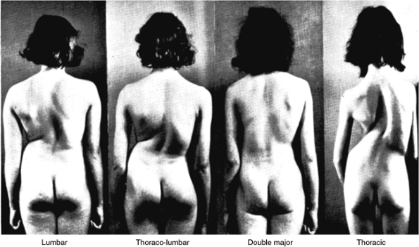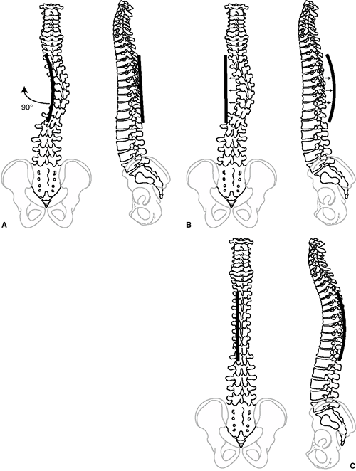 averaging 50 to 60 degrees (range 35 to 80 degrees, T12-S1) (Figure 18.2) (1,2,3). The scoliotic spine deviates from midline in the frontal plane and rotates maximally at the apex of the curve (4,5).