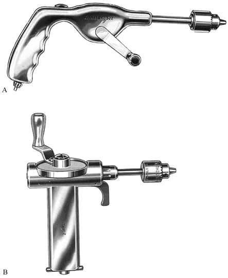 and is cannulated for long pins and wires. A small hand drill (B) (Bunnell type), 5-in. long, cannulated, with a 5/32-in. chuck, is designed for small bone surgery. (Courtesy of Zimmer, Warsaw, IN.)