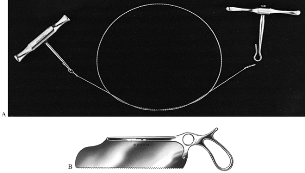 The Gigli spiral saw (A) is available in 12-in. (305 mm) and 20-in. (508 mm) lengths with a pair of handles. The Satterlee bone saw (B) is used for amputations, but most surgeons have abandoned it in favor of power saws. (B is courtesy of Zimmer, Warsaw, IN.)