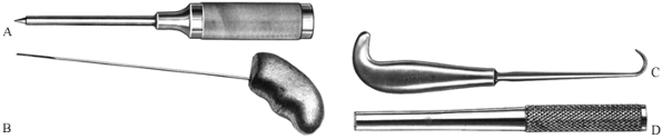shapes. The inside diameter of the hooks range from 3/8 in. (9.5 mm) to 1 in. (25 mm). Bone tamps (D) are used to pack bone graft into place and to countersink wires. These are 6 in. (152 mm) long, with a 3/8-in. (9.5 mm) or ½-in. (13 mm) end diameter. (B—D are courtesy of Zimmer, Warsaw, IN.)