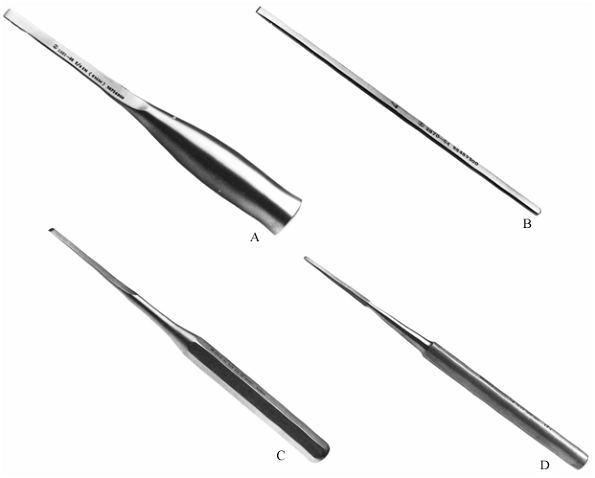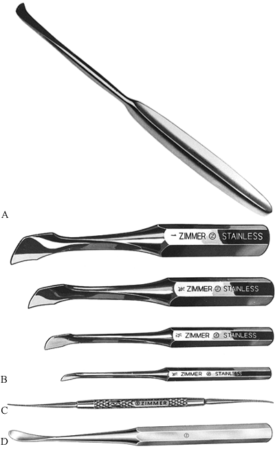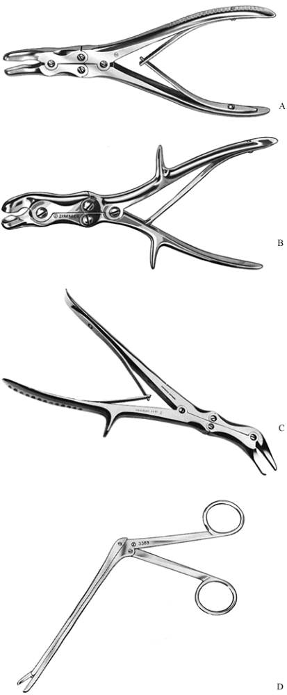 rongeur (D) has a 5-in. (127 mm) shaft with 2 × 10-mm bite and straight or up- and down-angled jaws. (Courtesy of Zimmer, Warsaw, IN.)