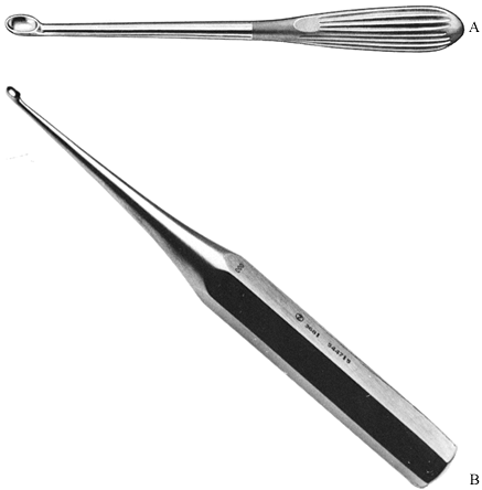 the Ruskin rongeur (A). Its length is 7¼ in. (184 mm). The Stille-Leur rongeur (B) has a 10-mm bite and straight or curved blades. Its lengths are 8½ in. (216 mm) and 10½ in. (267 mm).