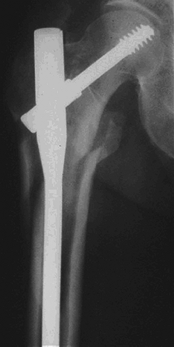 Figure 30.6. Reverse obliquity fracture stabilized with a cephalomedullary nail.(From Bucholz RW, Heckman JD, Court-Brown C, et al., eds. Rockwood and Green’s Fractures in Adults, 6th ed. Philadelphia: Lippincott Williams & Wilkins, 2006.) -