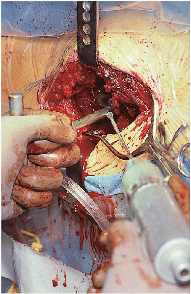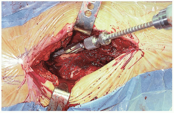 Insertion of the plate-holding screws. The need for compression is determined by direct visualization of the lag screw within the plate barrel. |