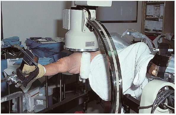 Patient positioning. The uninvolved leg is flexed, abducted, and externally rotated to allow positioning of the image intensifier. |