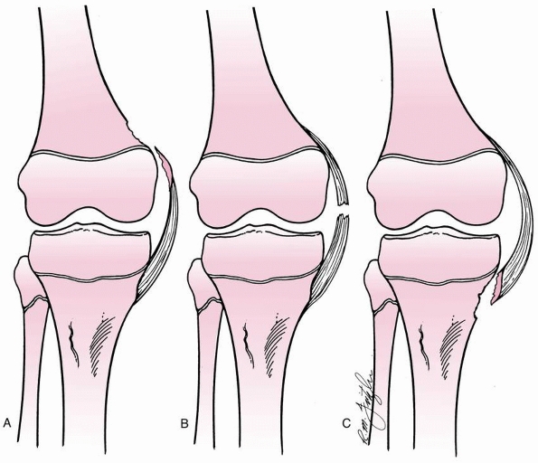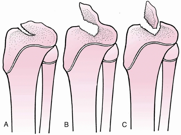 FIGURE 24-2 Classification of tibial spine fractures. A. Type I, minimal displacement. B. Type II, hinged posteriorly. C. Type III, complete separation.