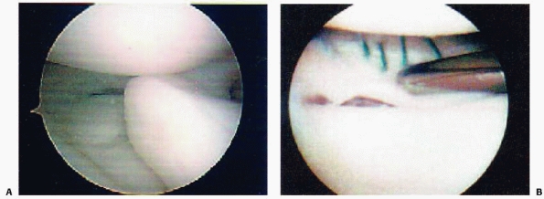 fixation of tibial eminence fractures, Kocher et al.177 found no associated chondral injuries and associated meniscal tear in only 3.8% (3/80) of patients (Fig. 24-1). Associated collateral ligament injury