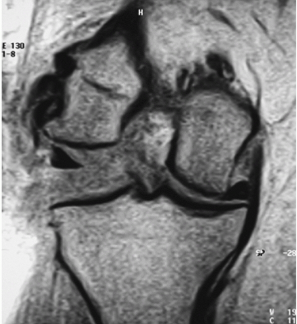Medial compartment arthritis evidenced by medial joint space narrowing in a 24-year-old man, 5 years after a complete knee dislocation with popliteal artery injury (KD IIIM). |
