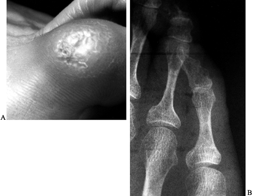 Figure 113.6. A: A hard hyperkeratotic region over the PIP joint of the fifth toe. B: The radiograph of the toe.