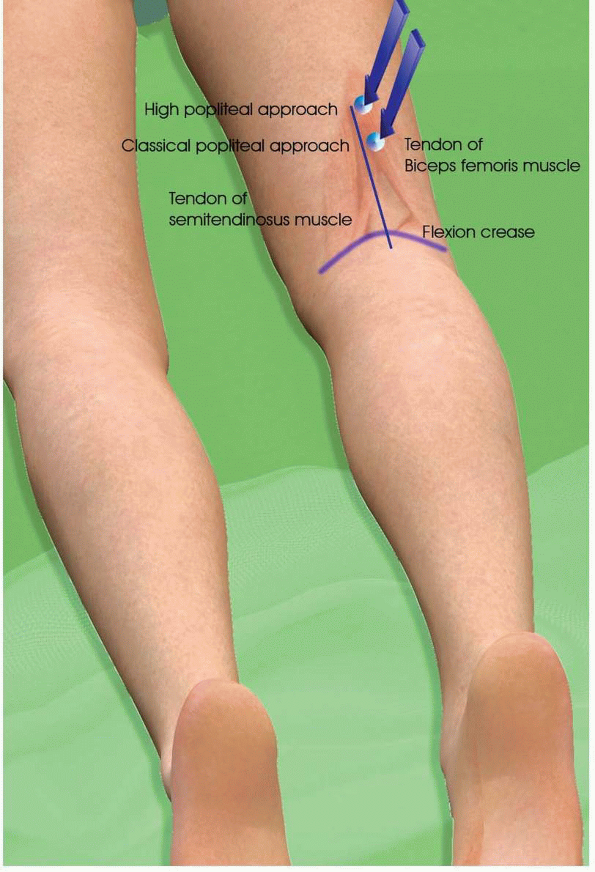 Transsartorial approach: sartorius muscle above the medial side of the patella. The needle is inserted at a 45-degree angle posterior to the sartorius muscle.