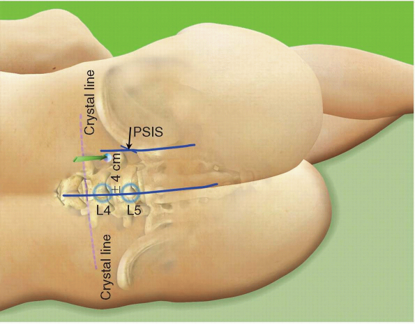 Insertion point is 6 to 7 cm caudal to the posterior superior iliac spine on this line.