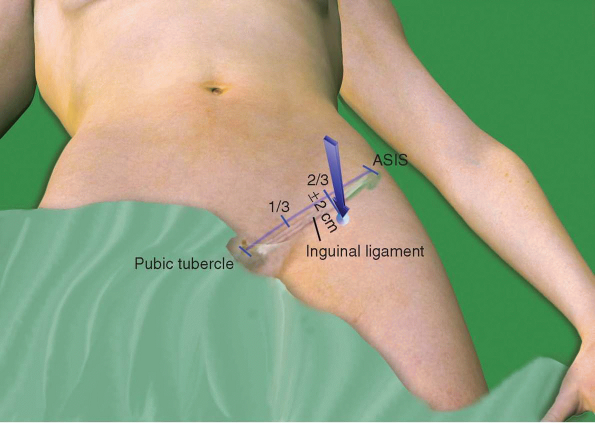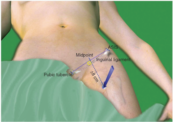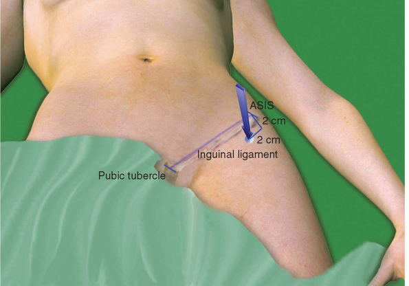 If the femoral artery pulse cannot be felt, the puncture point will be approximately 1 cm lateral to a point located 5 cm caudally on a perpendicular line at the midpoint of the line ASIS-PT.