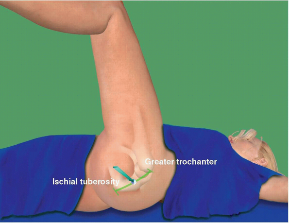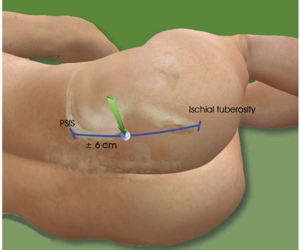 Needle is introduced perpendicular to the skin or at a 30-degree angle in the cranial direction. Upon bone contact (deep landmark), the sciatic nerve is located 2 to 3 cm deeper. This bone contact corresponds to the medial part of the
