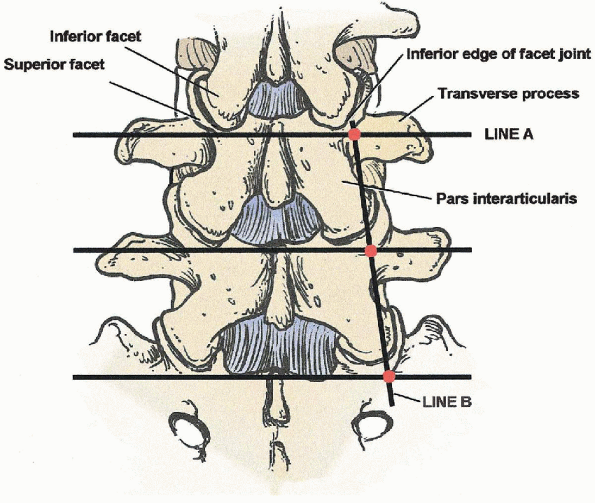 FIGURE 19-17. Starting point for pedicle screw: cross-section of line A bisection of transverse processes and B lateral border of the pars interarticularis.