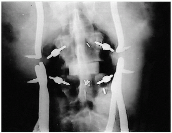 FIGURE 19-23. Intraoperative anteroposterior x-ray film with markers in pedicles of L3 and L4.