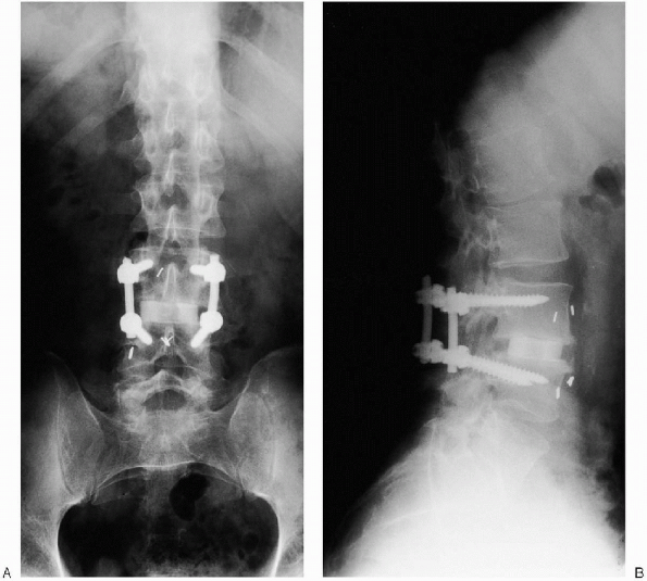 FIGURE 19-30. A: Anteroposterior x-ray film of final construct. B: Lateral x-ray film of final construct.