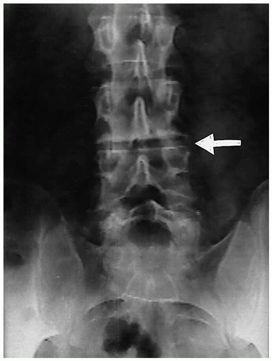 FIGURE 19-29. Anteroposterior x-ray film after anterior lumbar interbody fusion (ALIF) (arrow at femoral ring).