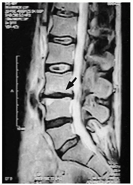diminished signal on the T-2 weighted image indicating disc desiccation (Fig. 19-6).