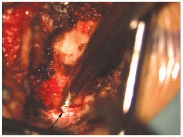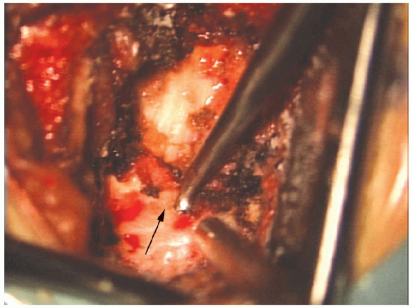 FIGURE 17-22. A no. 15 scalpel blade (arrow) can be used to cut the ligamentum flavum aiding removal.